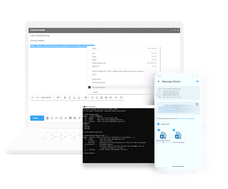 One-click. Complete protection. Cypherdog Encryption allows you to encrypt and decrypt any text or file and send it using any media, including e-mails supported by plugins for Firefox, Chrome, and Edge browsers, Gmail/Google Suite, AddIns in Outlook, and Thunderbird.